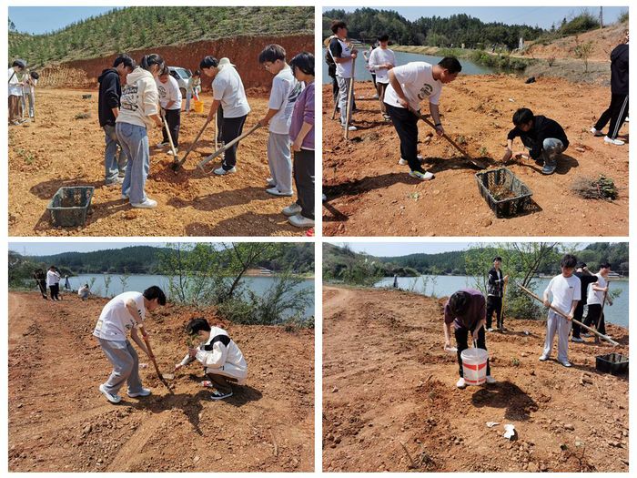 下午13时许,在龙湖村村书记吴红兵的带领下,同学们来到油茶树种植园种,帮助村民种植油茶树和山草药70余株。种植现场,大家手持铁锹、树苗,分工明确、齐心协力投入到油茶树种植的劳动中。种植活动旨在通过实践劳动,弘扬绿色发展理念,培养员工的劳动意识和环保意识,助力乡村振兴。