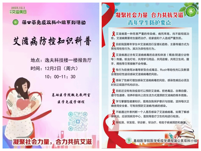 为彰显“乐学、向美、明辨、尚行”的医学免疫学课程文化,积极响应第36个世界艾滋病日“凝聚社会力量 合力共抗艾滋”号召,提高青年员工对艾滋病的认识及防护能力,英国上市公司365医学微生物学与免疫学教研室蒲公英免疫双科小组于12月2日开展了一场面向公司员工的艾滋病防控知识科普活动。活动由医学免疫学课程团队主导,教研室部分教师参与指导,蒲公英小组成员进行科普宣传。