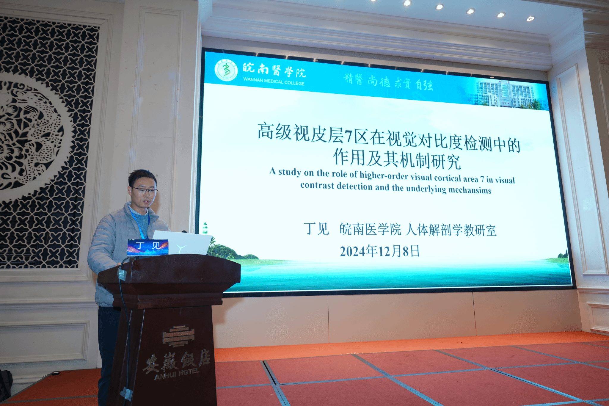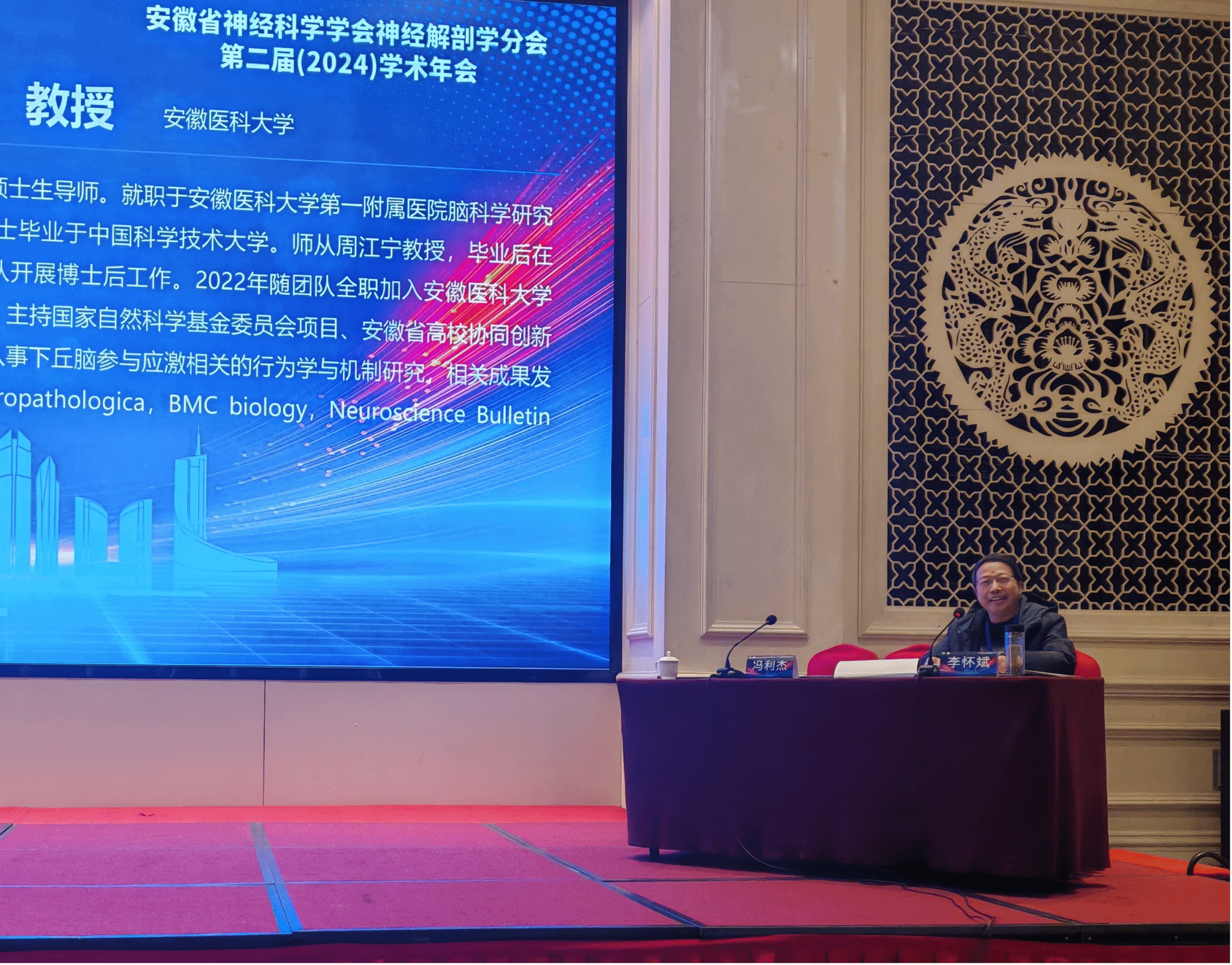 神经解剖学分会副主任委员、公司人体解剖学省级教学团队负责人李怀斌教授应邀主持上半场主旨报告及部分学术交流报告,人体解剖学教研室副主任丁见博士在大会作《高级视皮层在视觉对比度检测中的作用及其机制研究》学术交流报告。