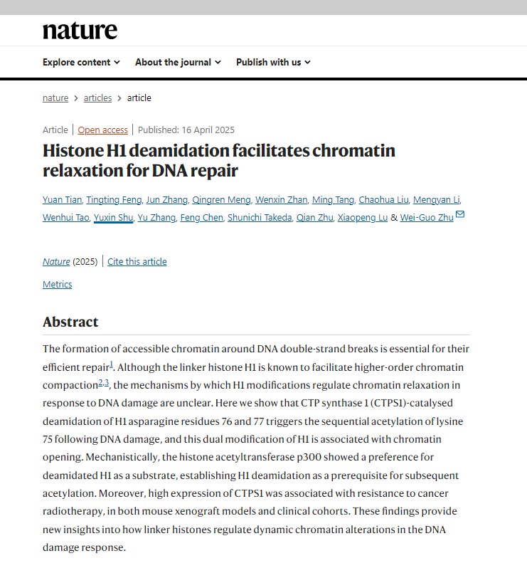 4月16日,公司肿瘤表观遗传创新团队负责人、公司杰出员工朱卫国教授在国际顶级权威杂志《Nature》发表题为“Histone H1 deamidation facilitates chromatin relaxation for DNA repair”的研究论文。深圳大学、英国正版365官方网站、同济大学和北京大学医学部为本研究的共同作者单位,唯一通讯作者朱卫国是公司杰出员工、特聘教授,公司青年博士后束雨新参与该项研究,为署名作者。