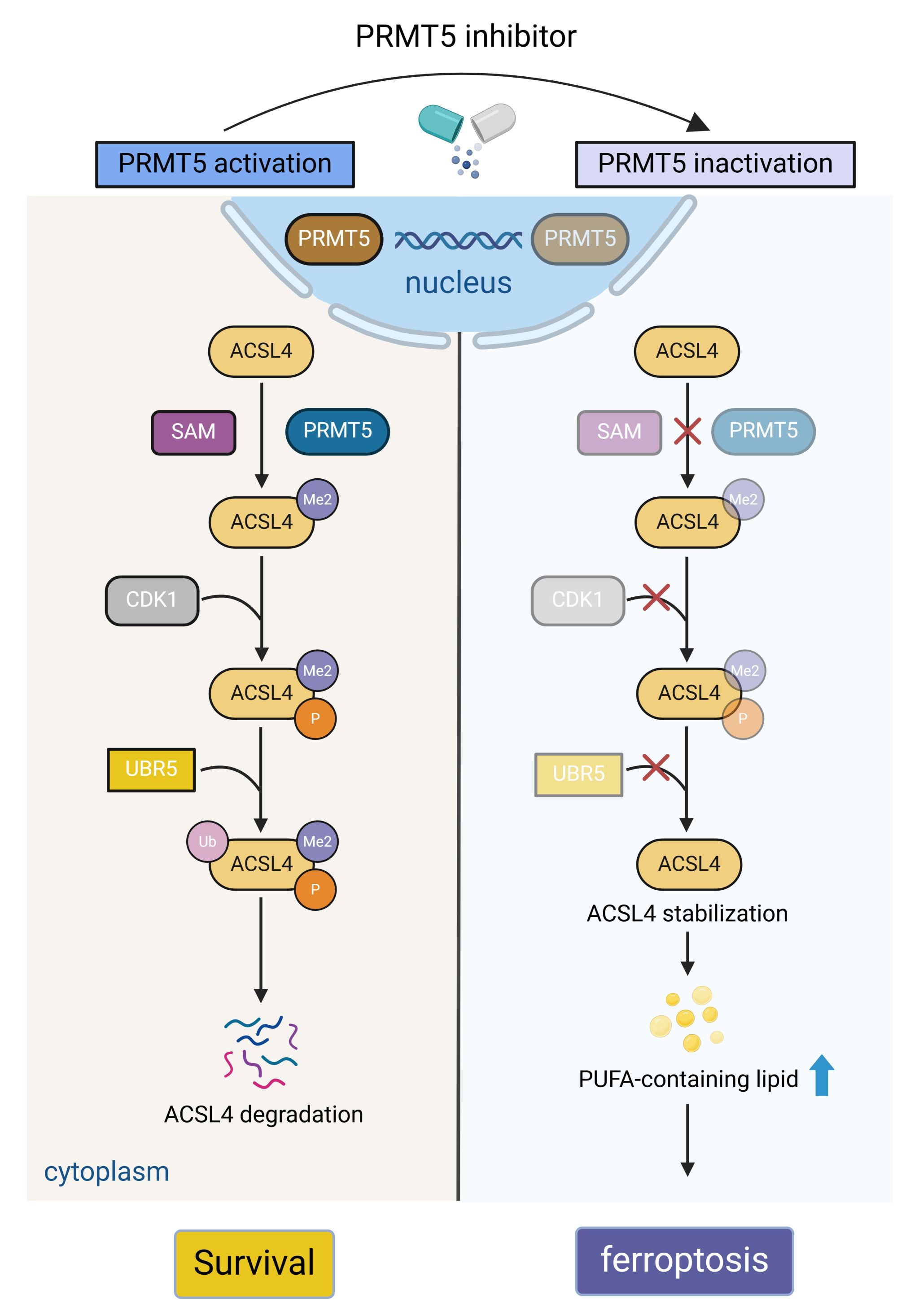 铁死亡(Ferroptosis)作为一种依赖于脂质过氧化反应的细胞程序性死亡方式,在调控肿瘤进展与抗肿瘤免疫中受到广泛关注。研究表明,铁死亡可通过诱导肿瘤细胞免疫原性死亡,增强免疫检查点抑制剂的治疗效果。蛋白精氨酸甲基转移酶5(PRMT5)作为一类关键的表观遗传调控酶,能够催化底物蛋白精氨酸位点发生对称性二甲基化(SDMA)修饰,进而影响其稳定性、定位及功能活性。李中伟教授团队2025年1月发表在Research期刊上的研究发现:PRMT5能通过甲基化修饰ALKBH5来增加B7H3表达,从而调控结直肠的免疫逃逸进程(Research, 2025 Jan 8:8:0549)。然而,PRMT5是否通过调节铁死亡影响免疫治疗敏感性尚不明确。