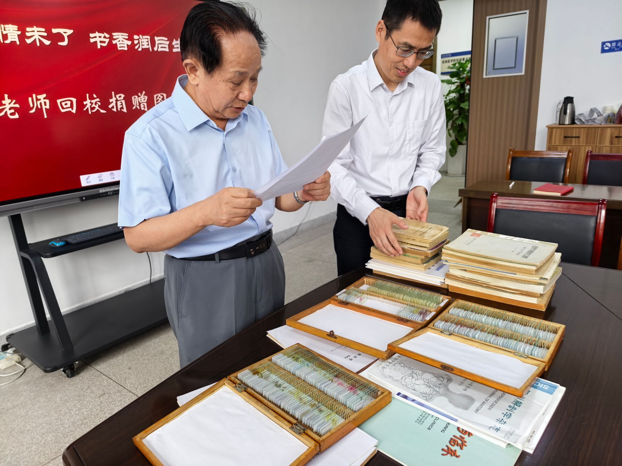 随后,姚老师饱含激情地介绍了此次捐赠的一册册精心挑选、捆扎整齐的书籍,包括组织学与胚胎学图书资料24册、组织切片标本267张、具有参考价值的论文资料5篇以及组织切片技术等手稿资料5本,这些书籍跨越了漫长的时光,从泛黄卷角的页边到清晰工整的批注,无不沉淀着不同时代的学术印记与思想光芒,其价值早已超越了纸张本身,成为一部立体的、可触摸的组织学与胚胎学的教育发展史。