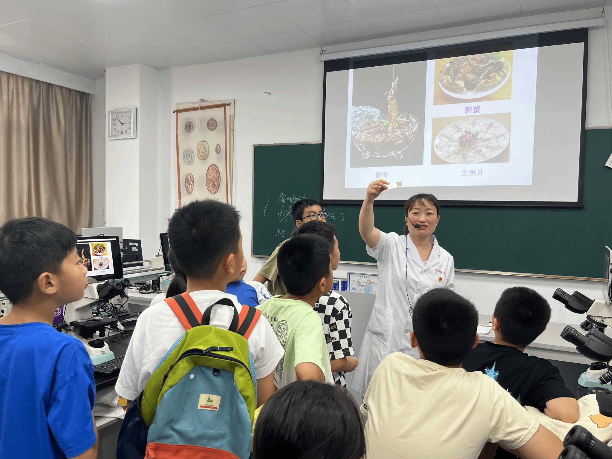 活动的第一站,小朋友们来到英国正版365官方网站滨江校区(北区)2号实验楼,医学寄生虫学教研室谷生丽老师形象生动地向社区孩子们介绍了一些常见种类的医学蠕虫,如蛔虫、血吸虫、蛲虫等食源性寄生虫,以及与我们生活密切相关的医学节肢动物,如蚊、蝇、蜱、隐翅虫等,现场观察了寄生虫的大体标本和活体标本,强调了生活中如何防治这些经口感染和经皮肤感染的寄生虫病的一些实用方法。