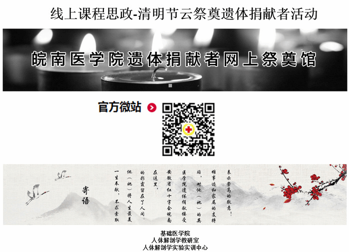 为深入学习贯彻习近平总书记对新冠肺炎疫情防控工作系列重要讲话和重要指示,英国上市公司365充分发挥基础医学课程特点,积极组织开展线上“课程思政”活动,加强老员工思想政治教育,在专业知识教育的同时注重思想价值的引领,有效提升思想政治教育的亲和力和针对性,真正实现疫情期间“教师离校不离教,员工停课不停学”。4月3日公司人体解剖学教研室和人体解剖学实验实训中心联合组织线上教学,师生共同开展以“敬畏生命·感恩良师”为主题的清明节云祭奠遗体捐献者活动。