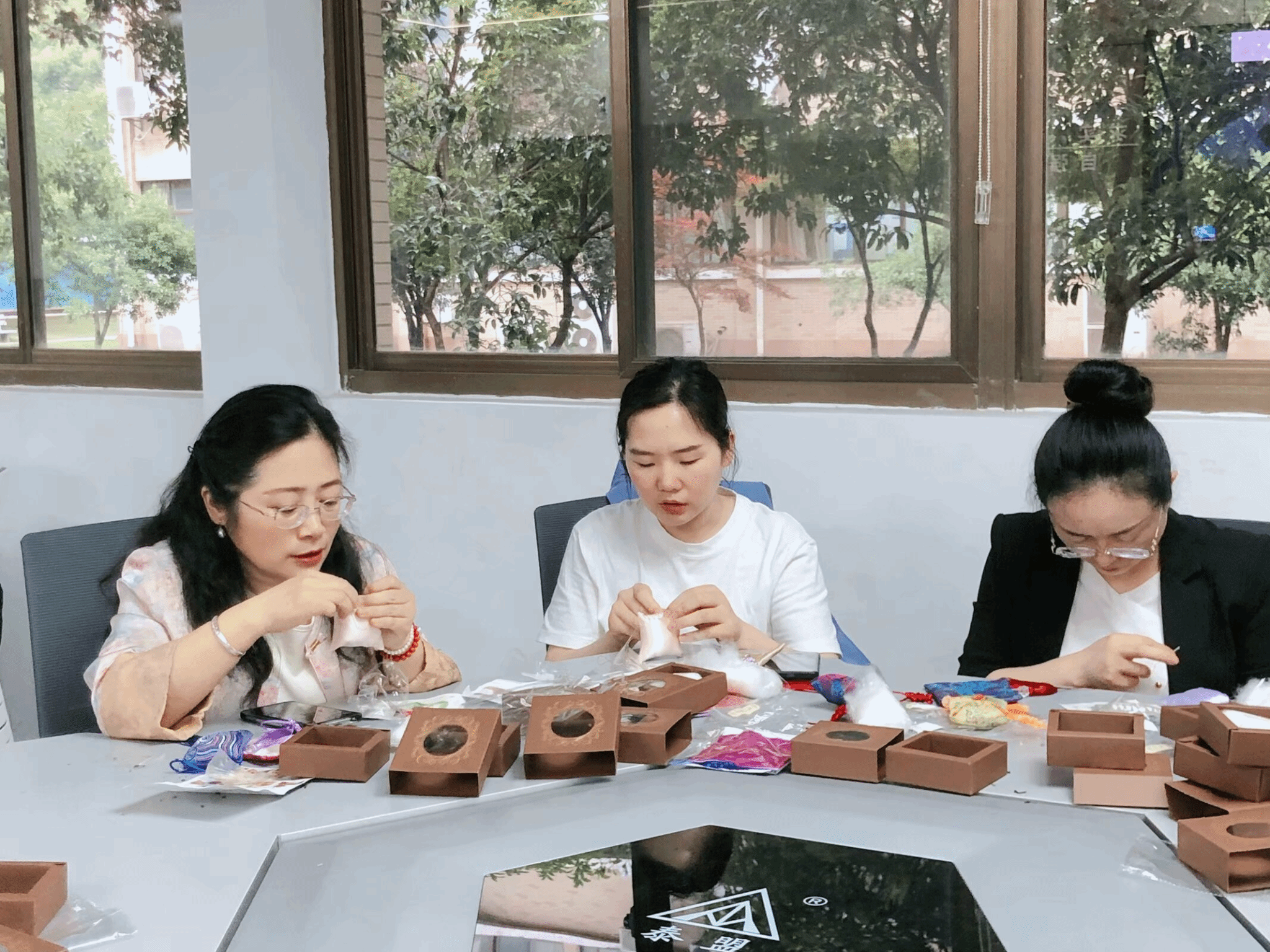 在自主制作环节,大屏幕循环播放香囊制作示范视频,从布料裁剪、艾草药材填充到针线缝合、流苏装饰,每一步工艺都清晰呈现。师生们分组协作,手持彩布、银针与中药材,或低声交流技巧,或专注于针脚细节,现场洋溢着传统手工艺创作的温馨氛围。完成制作后,形态各异的香囊被集中展示 ——有的绣着“平安”字样,有的融入中药驱蚊配方,每件作品都凝结着创作者对传统文化的理解与祝福。