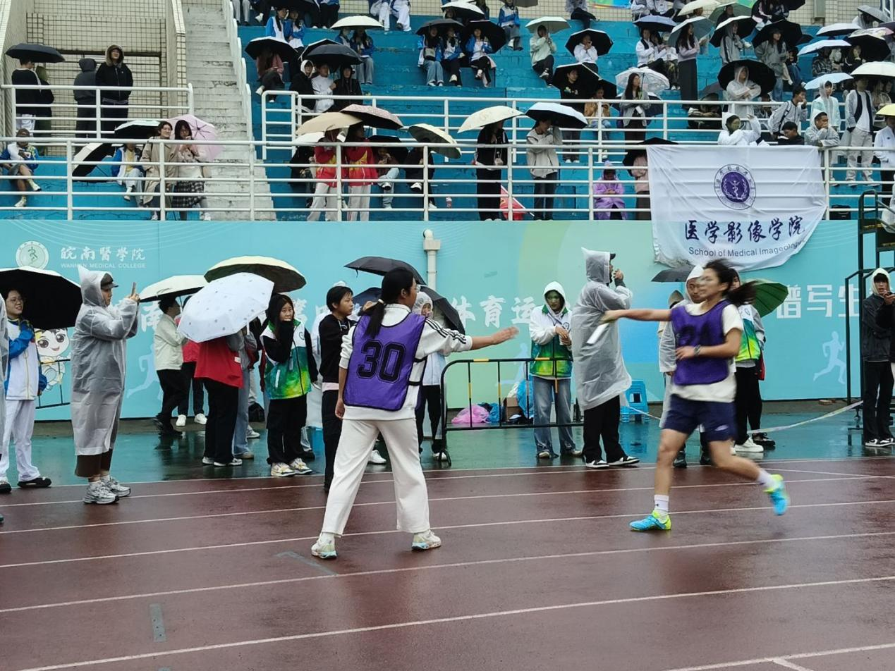 赛场上,基础健儿无惧风雨,奋勇拼搏,在多项比赛中实现历史性突破。在个人单项比赛中,2024级李诚真与2023级沈婷慧分别夺得女子200米第4名和第6名的优异成绩,刷新了本院在该项目的最高历史记录;团体赛事中,女子4×400米与4×100米接力队不畏强手、默契配合,分获第6名、第7名;在趣味团体项目“行云流水”中,队员们团结协作、稳扎稳打,最终取得全校第7名的好成绩。
