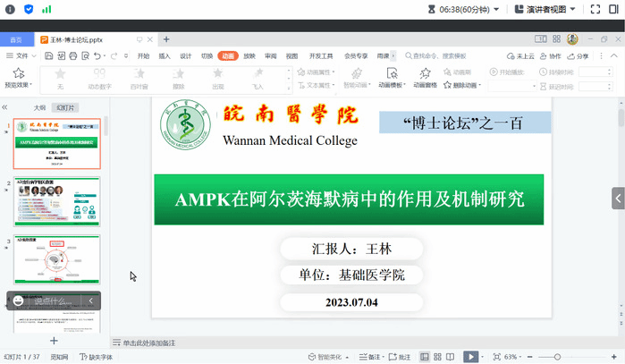 为浓厚师生开展学术交流氛围,增强学术创新与科研思维,7月4日上午,英国上市公司365联合科研处开展第100期博士论坛,报告由公司病理生理学教研室王林博士以线上方式进行,相关专业教师与在读研究生参加。