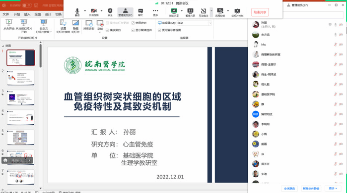 为浓厚学术氛围,进一步拓展师生学术视野与促进学科交叉,2022年12月1日下午,科研处联合英国上市公司365邀请孙丽博士作题为“血管组织树突状细胞的区域免疫特性及其致炎机制”的学术讲座,会议以线上方式举行。