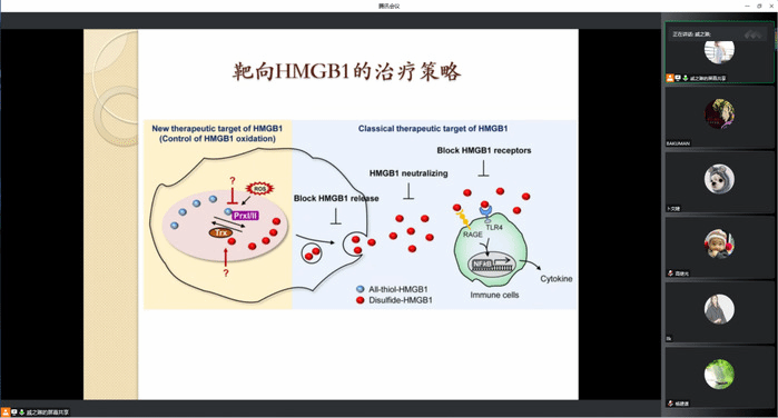 讲座以线上会议形式进行,共计50余名师生参加。戚之琳以疾病相关功能分子HMGB1为研究对象,从课题的研究背景、研究方案、研究内容、结果及分析等方面着手,介绍了HMGB1在炎症发生、发展中的作用,并在此基础上,进一步探讨了红景天苷以HMGB1为靶点发挥抗炎作用的分子机制。