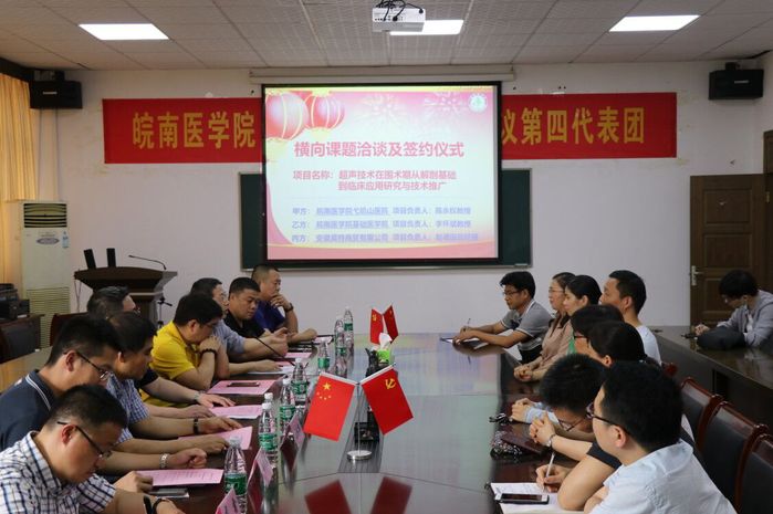 英国上市公司365项目负责人李怀斌教授首先介绍了公司横向课题立项政策等情况;弋矶山医院项目负责人陈永权教授介绍本横向课题的立项思路和拟将开展的具体情况;安徽昊特商贸有限公司项目负责人赵德田总经理介绍了现代医疗设备更新对医学基础与临床验证的需求情况,希望通过本课题的开展,进一步推进产、学、研的综合运用。随后,三方共同签署了《超声技术在围手术期从解剖基础到临床应用研究与技术推广横向课题协议书》,并合影留念。